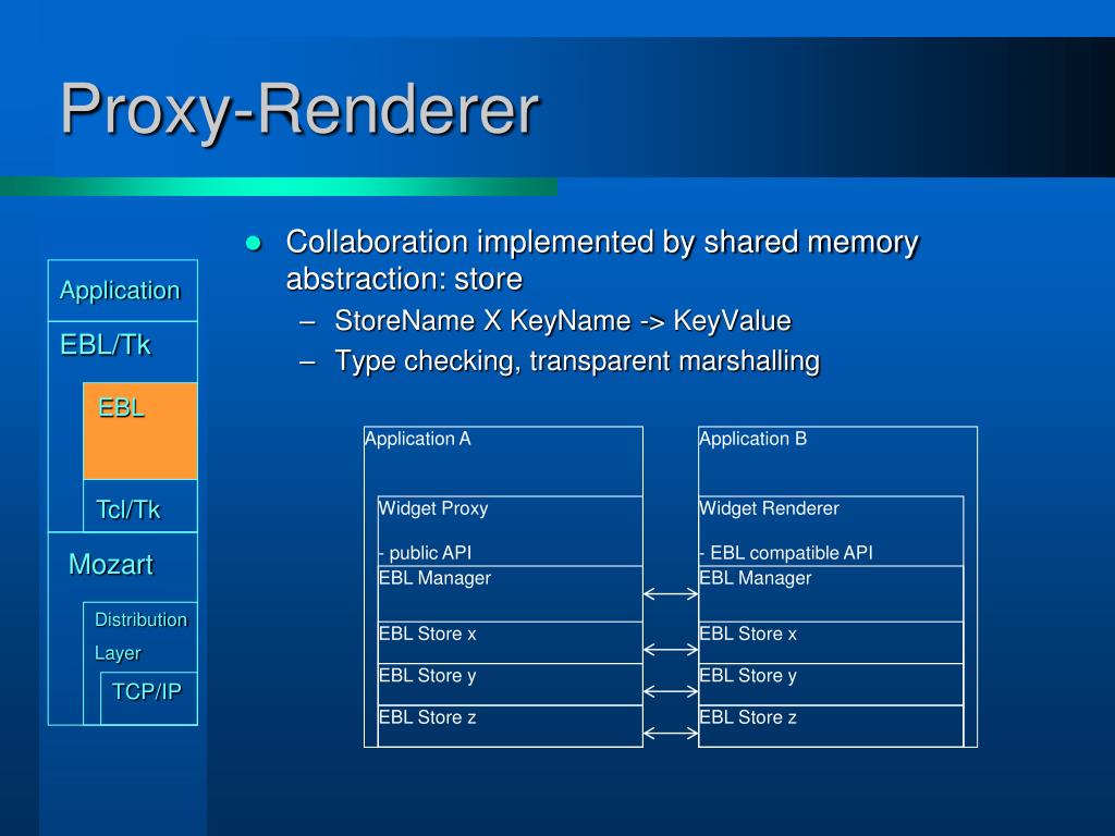 Application EBL/Tk EBL Tcl/Tk Mozart Distribution Layer TCP/IP Adaptation • Alternate compatible renderers Widget X definition Proxy X Renderer X1 Widget Y definition Renderer Y1 Proxy Y Renderer Y2 Renderer Y3