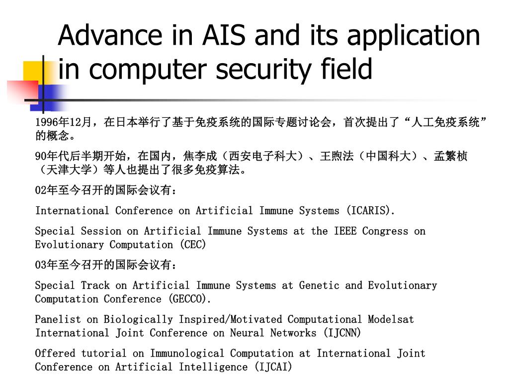 Advance in AIS and its application in computer security field 1996年12月,在日本举行了基于免疫系统的国际专题讨论会,首次提出了“人工免疫系统”的概念。 90年代后半期开始,在国内,焦李成(西安电子科大)、王煦法(中国科大)、孟繁桢(天津大学)等人也提出了很多免疫算法。 02年至今召开的国际会议有: International Conference on Artificial Immune Systems (ICARIS). Special Session on Artificial Immune Systems at the IEEE Congress on Evolutionary Computation (CEC) 03年至今召开的国际会议有: Special Track on Artificial Immune Systems at Genetic and Evolutionary Computation Conference (GECCO). Panelist on Biologically Inspired/Motivated Computational Modelsat International Joint Conference on Neural Networks (IJCNN) Offered tutorial on Immunological Computation at International Joint Conference on Artificial Intelligence (IJCAI)