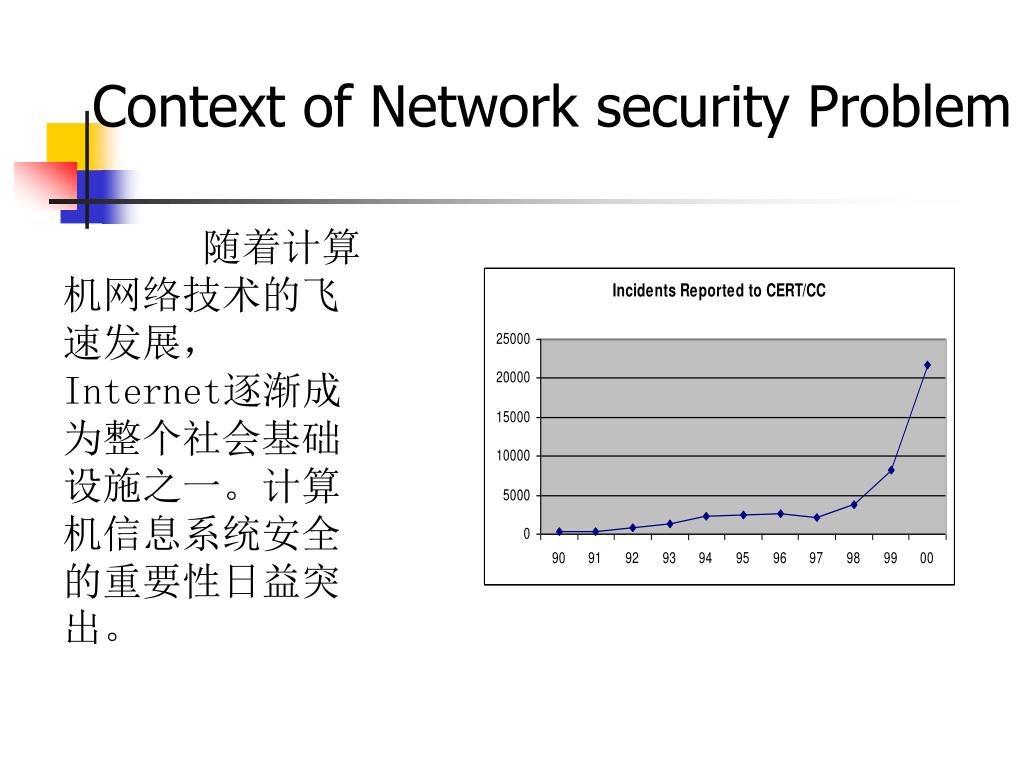 Context of Network security Problem 随着计算机网络技术的飞速发展,Internet逐渐成为整个社会基础设施之一。计算机信息系统安全的重要性日益突出。