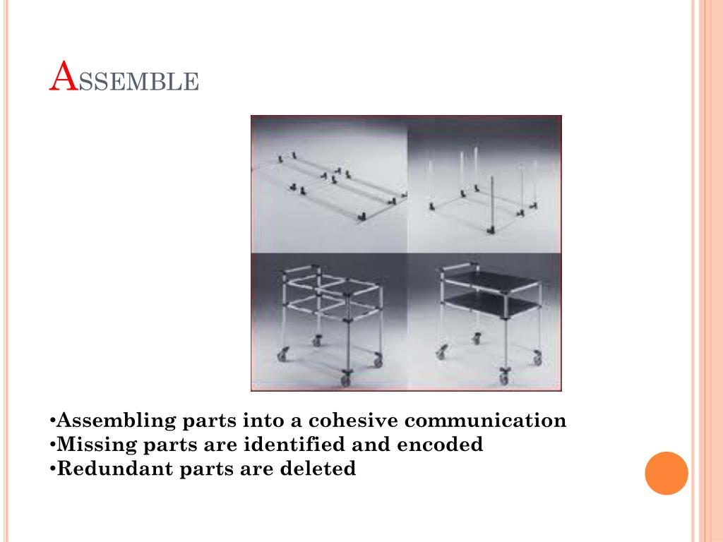 Assemble • Assembling parts into a cohesive communication • Missing parts are identified and encoded • Redundant parts are deleted