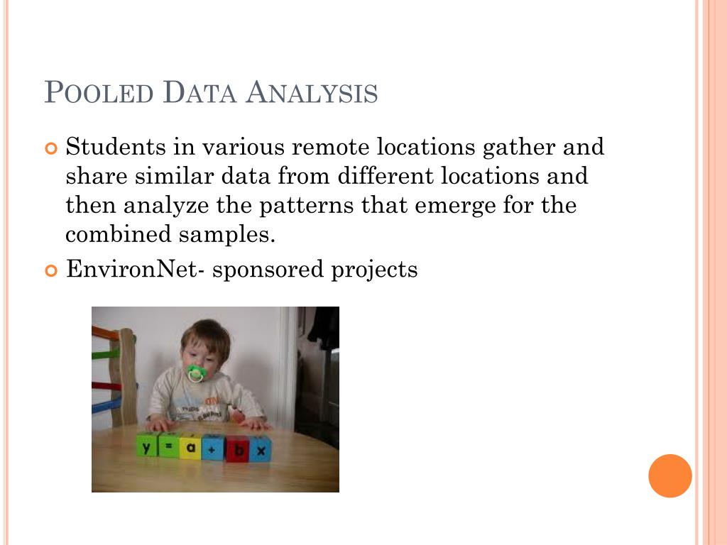 Pooled Data Analysis • Students in various remote locations gather and share similar data from different locations and then analyze the patterns that emerge for the combined samples. • EnvironNet- sponsored projects