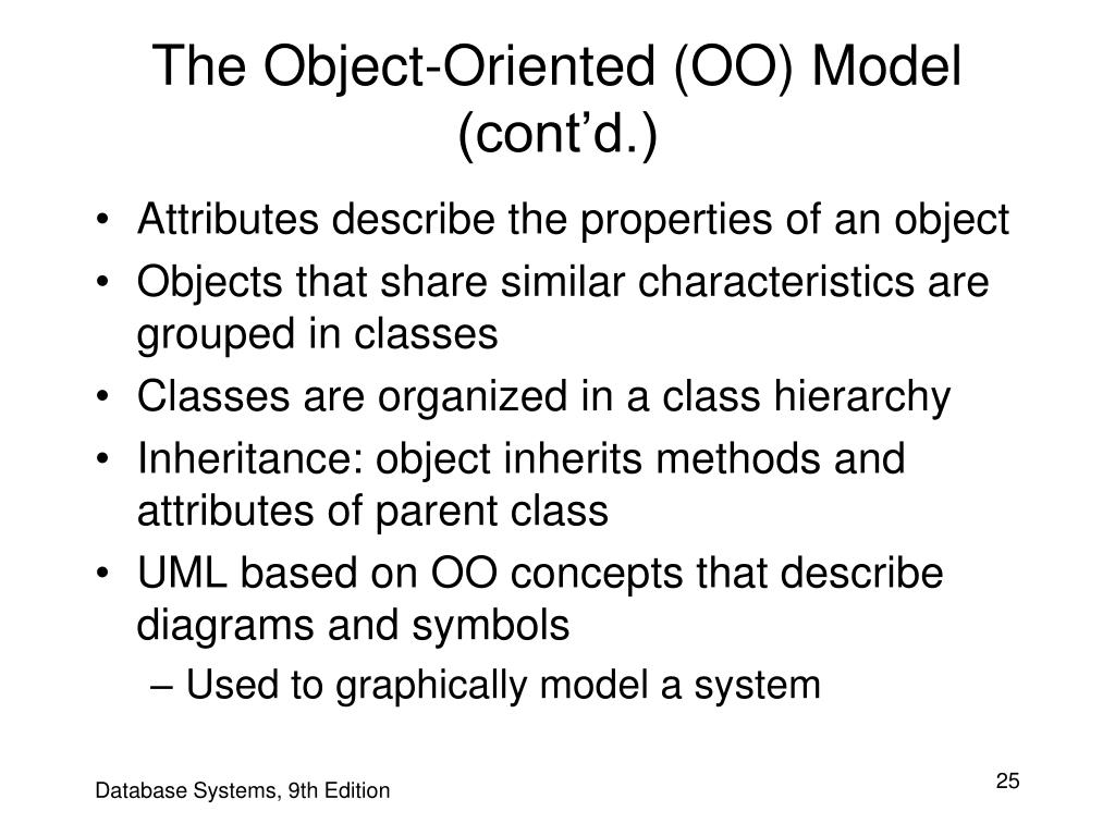 The Object-Oriented (OO) Model (cont’d.) • Attributes describe the properties of an object • Objects that share similar characteristics are grouped in classes • Classes are organized in a class hierarchy • Inheritance: object inherits methods and attributes of parent class • UML based on OO concepts that describe diagrams and symbols • Used to graphically model a system Database Systems, 9th Edition