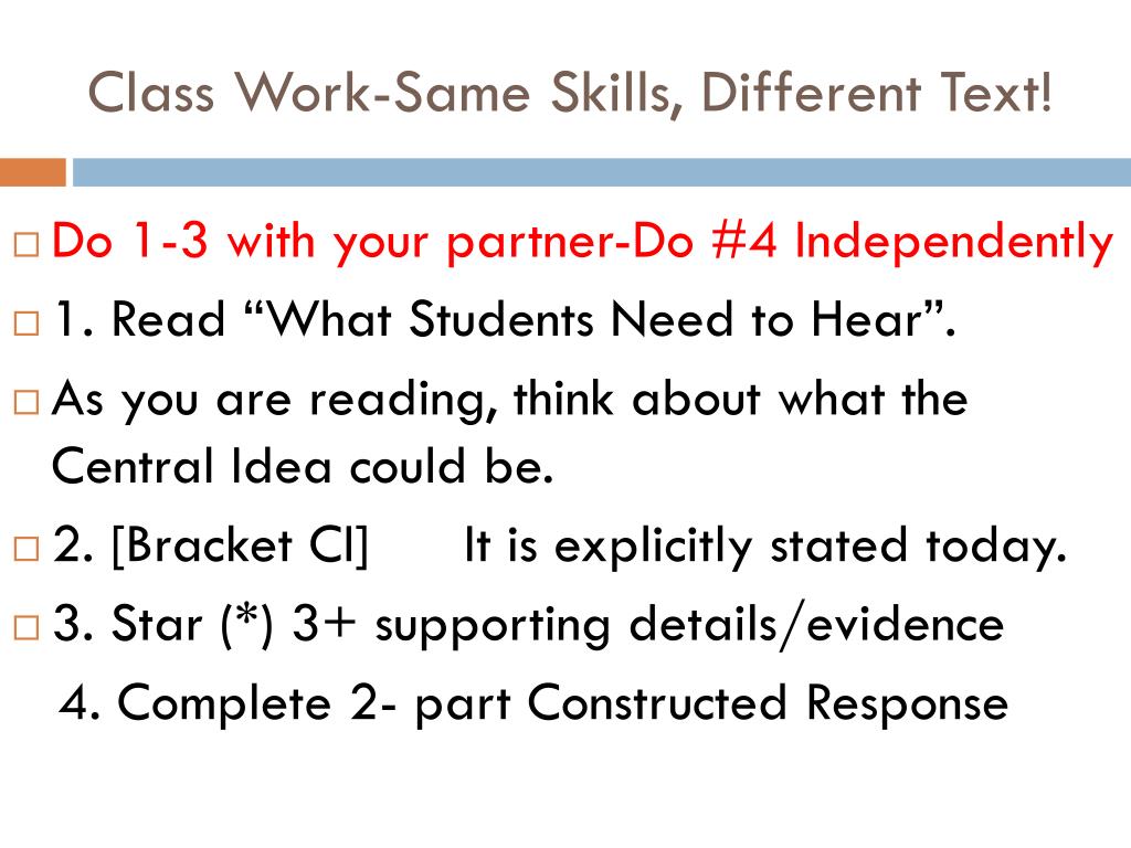 Class Work-Same Skills, Different Text! • Do 1-3 with your partner-Do #4 Independently • 1. Read “What Students Need to Hear”. • As you are reading, think about what the Central Idea could be. • 2. [Bracket CI] It is explicitly stated today. • 3. Star (*) 3+ supporting details/evidence 4. Complete 2- part Constructed Response