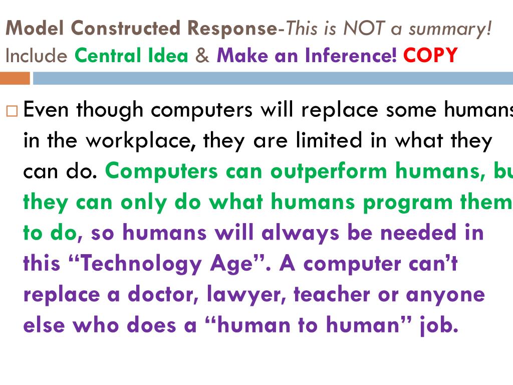 Model Constructed Response-This is NOT a summary!Include Central Idea & Make an Inference! COPY • Even though computers will replace some humans in the workplace, they are limited in what they can do. Computers can outperform humans, but they can only do what humans program them to do, so humans will always be needed in this “Technology Age”. A computer can’t replace a doctor, lawyer, teacher or anyone else who does a “human to human” job.