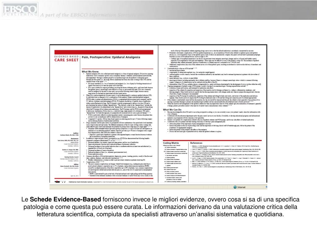 Le SchedeEvidence-Based forniscono invece le migliori evidenze, ovvero cosa si sa di una specifica patologia e come questa può essere curata. Le informazioni derivano da una valutazione critica della letteratura scientifica, compiuta da specialisti attraverso un’analisi sistematica e quotidiana.