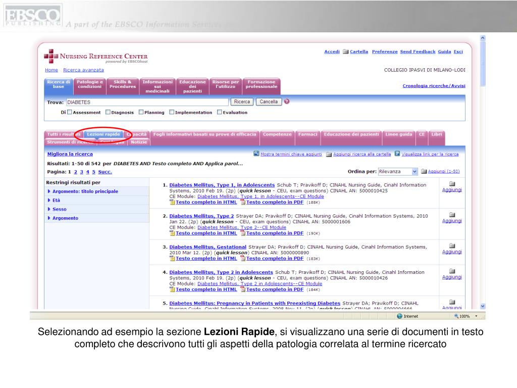 Selezionando ad esempio la sezione Lezioni Rapide, si visualizzano una serie di documenti in testo completo che descrivono tutti gli aspetti della patologia correlata al termine ricercato