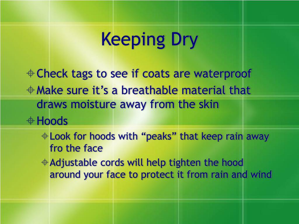 Keeping Dry • Check tags to see if coats are waterproof • Make sure it’s a breathable material that draws moisture away from the skin • Hoods • Look for hoods with “peaks” that keep rain away fro the face • Adjustable cords will help tighten the hood around your face to protect it from rain and wind