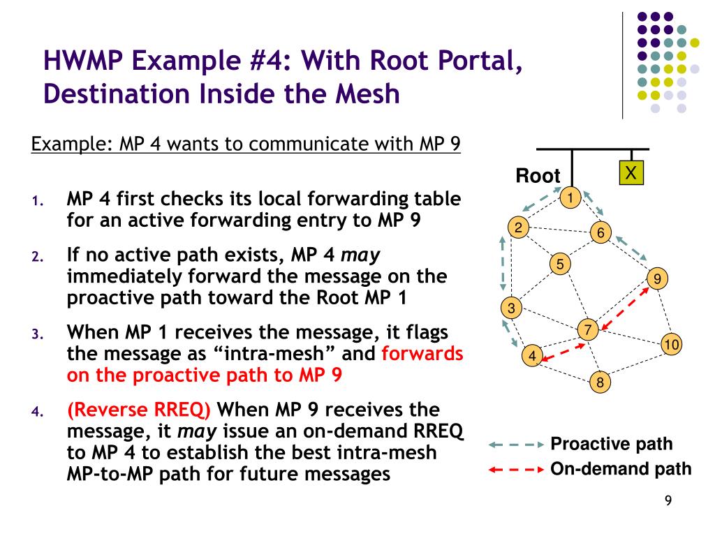 X 1 2 6 5 9 3 7 10 4 8 HWMP Example #4: With Root Portal,Destination Inside the Mesh Example: MP 4 wants to communicate with MP 9 • MP 4 first checks its local forwarding table for an active forwarding entry to MP 9 • If no active path exists, MP 4 may immediately forward the message on the proactive path toward the Root MP 1 • When MP 1 receives the message, it flags the message as “intra-mesh” and forwards on the proactive path to MP 9 • (Reverse RREQ) When MP 9 receives the message, it may issue an on-demand RREQ to MP 4 to establish the best intra-mesh MP-to-MP path for future messages Root Proactive path On-demand path