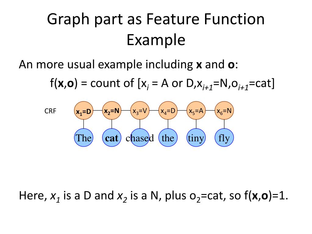 x1=D x2=N x3=V x4=D x5=A x6=N The cat chased the tiny fly Graph part as Feature Function Example An more usual example including x and o: f(x,o) = count of [xi = A or D,xi+1=N,oi+1=cat] Here, x1 is a D and x2 is a N, plus o2=cat, so f(x,o)=1. CRF
