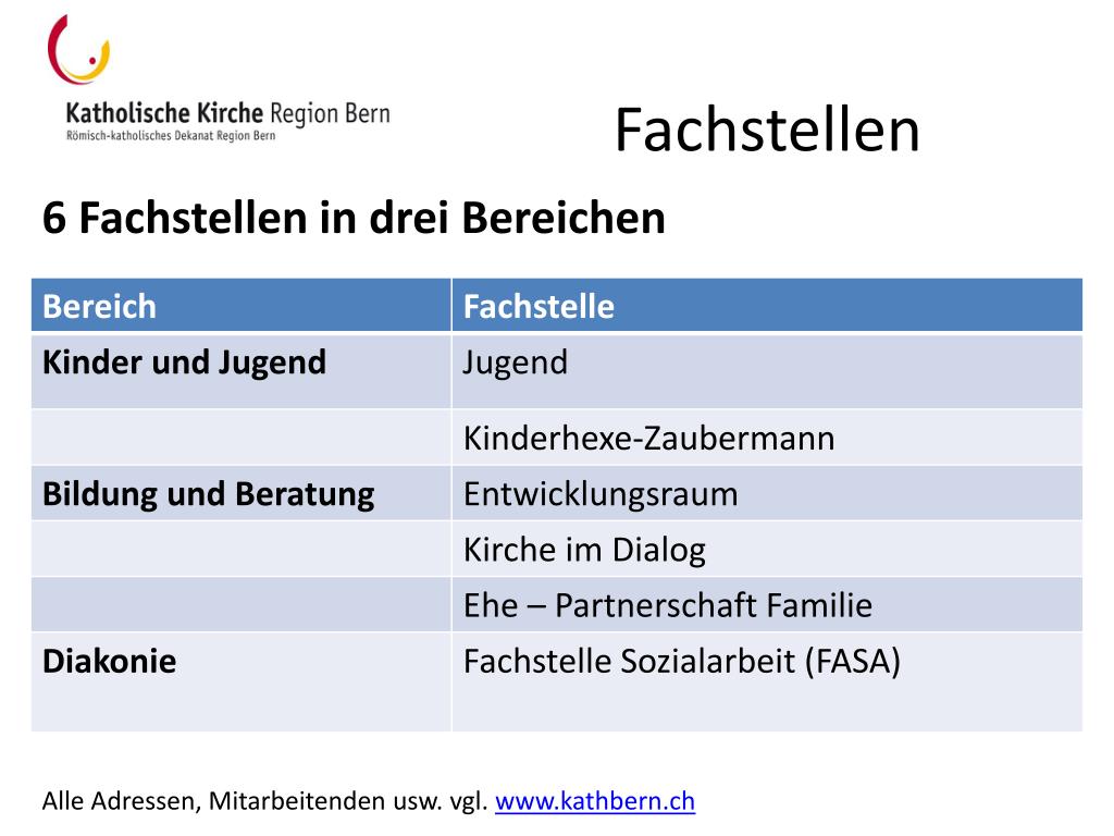 Fachstellen 6 Fachstellen in drei Bereichen Alle Adressen, Mitarbeitenden usw. vgl. www.kathbern.ch