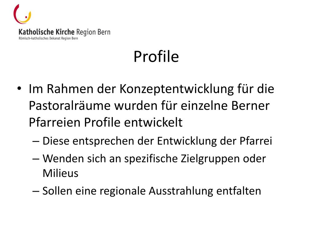 Profile • Im Rahmen der Konzeptentwicklung für die Pastoralräume wurden für einzelne Berner Pfarreien Profile entwickelt • Diese entsprechen der Entwicklung der Pfarrei • Wenden sich an spezifische Zielgruppen oder Milieus • Sollen eine regionale Ausstrahlung entfalten