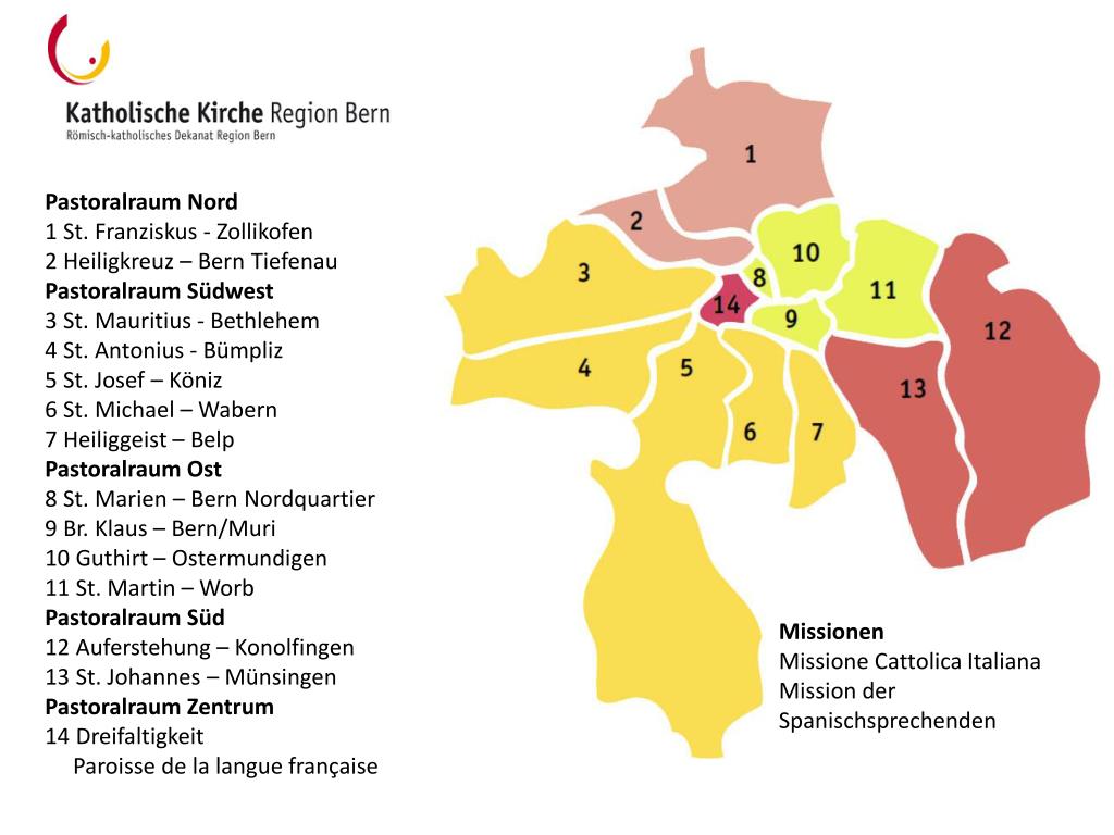 Pastoralraum Nord 1 St. Franziskus - Zollikofen 2 Heiligkreuz – Bern Tiefenau Pastoralraum Südwest 3 St. Mauritius - Bethlehem 4 St. Antonius - Bümpliz 5 St. Josef – Köniz 6 St. Michael – Wabern 7 Heiliggeist – Belp Pastoralraum Ost 8 St. Marien – Bern Nordquartier 9 Br. Klaus – Bern/Muri 10 Guthirt – Ostermundigen 11 St. Martin – Worb Pastoralraum Süd 12 Auferstehung – Konolfingen 13 St. Johannes – Münsingen Pastoralraum Zentrum 14 Dreifaltigkeit Paroisse de la langue française Missionen Missione Cattolica Italiana Mission der Spanischsprechenden