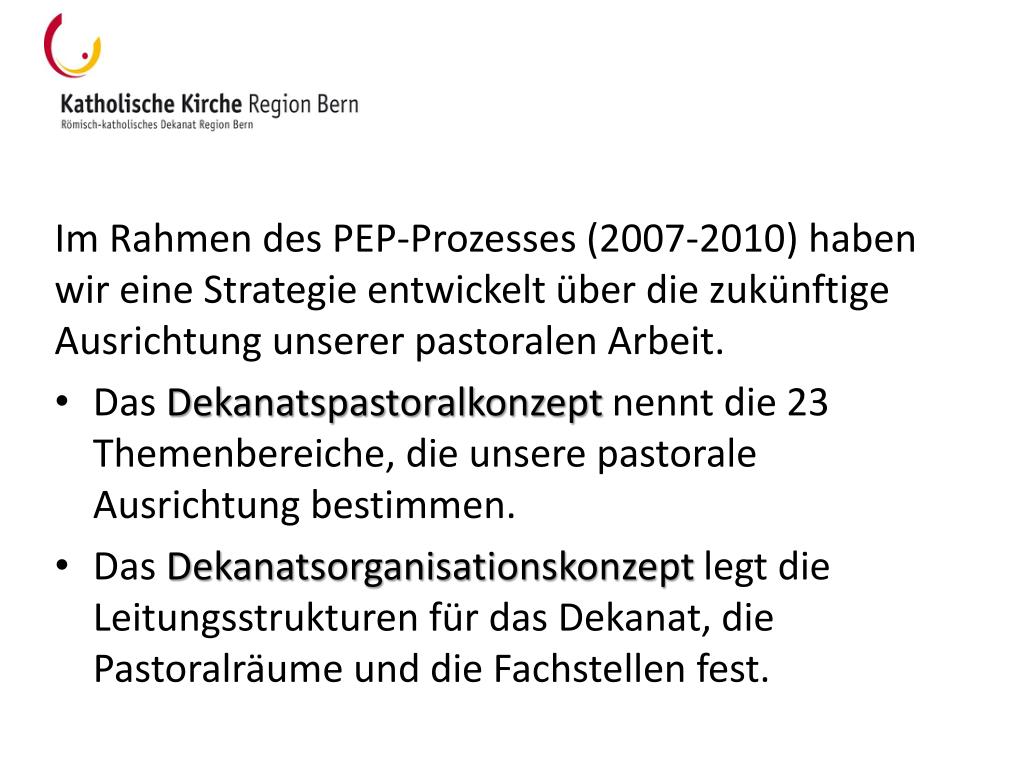 Im Rahmen des PEP-Prozesses (2007-2010) haben wir eine Strategie entwickelt über die zukünftige Ausrichtung unserer pastoralen Arbeit. • Das Dekanatspastoralkonzept nennt die 23 Themenbereiche, die unsere pastorale Ausrichtung bestimmen. • Das Dekanatsorganisationskonzept legt die Leitungsstrukturen für das Dekanat, die Pastoralräume und die Fachstellen fest.