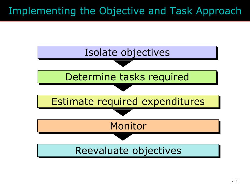 Implementing the Objective and Task Approach Isolate objectives Determine tasks required Estimate required expenditures Monitor Reevaluate objectives