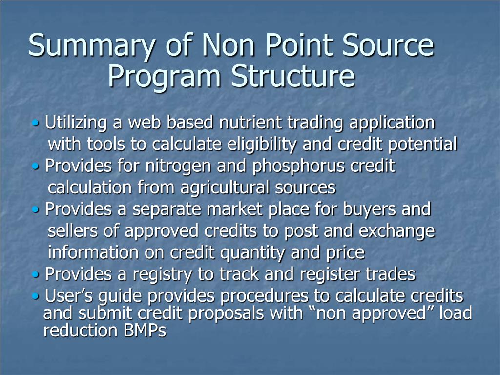 Summary of Non Point Source Program Structure • Utilizing a web based nutrient trading application with tools to calculate eligibility and credit potential • Provides for nitrogen and phosphorus credit calculation from agricultural sources • Provides a separate market place for buyers and sellers of approved credits to post and exchange information on credit quantity and price • Provides a registry to track and register trades • User’s guide provides procedures to calculate credits and submit credit proposals with “non approved” load reduction BMPs