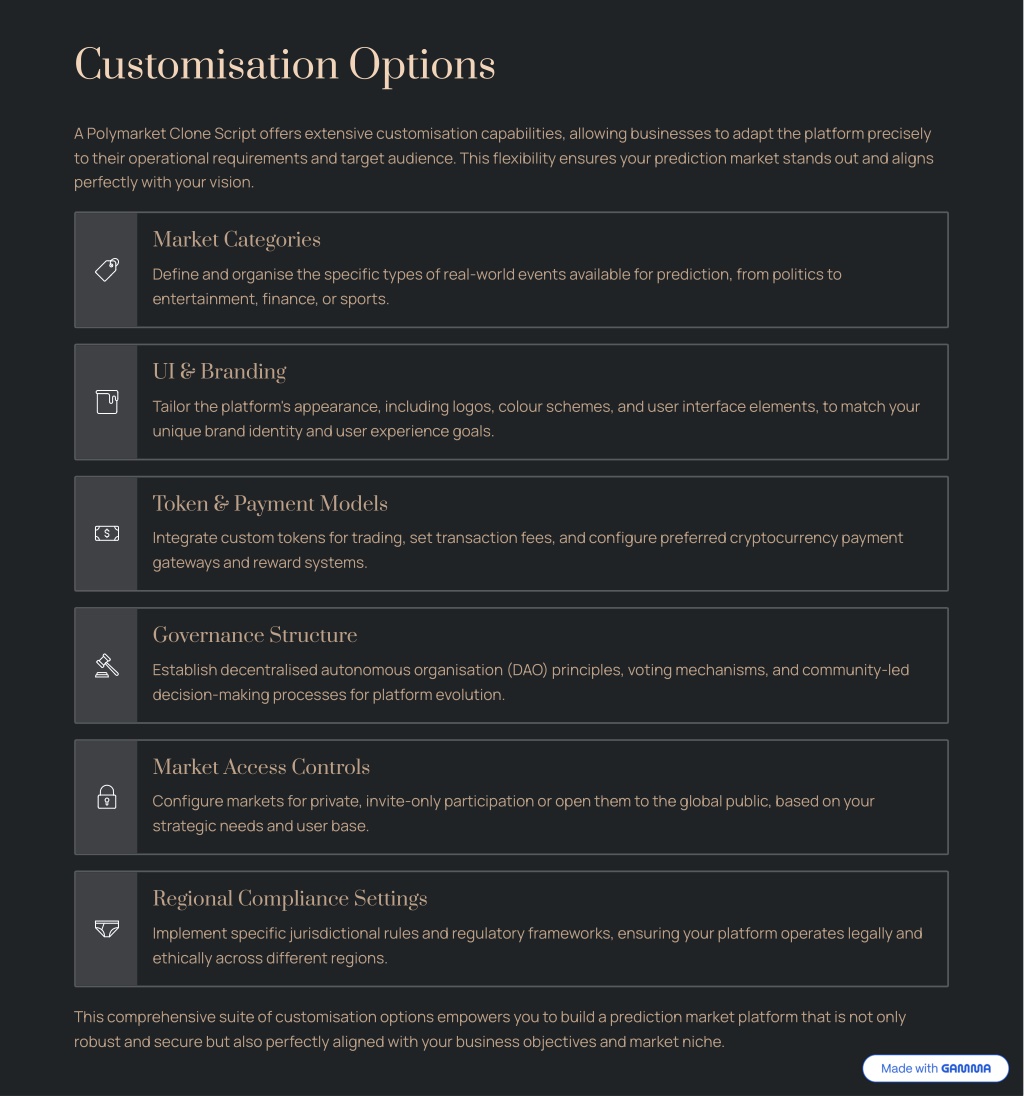 Customisation Options A Polymarket Clone Script offers extensive customisation capabilities, allowing businesses to adapt the platform precisely to their operational requirements and target audience. This flexibility ensures your prediction market stands out and aligns perfectly with your vision. Market Categories Define and organise the specific types of real-world events available for prediction, from politics to entertainment, finance, or sports. UI & Branding Tailor the platform's appearance, including logos, colour schemes, and user interface elements, to match your unique brand identity and user experience goals. Token & Payment Models Integrate custom tokens for trading, set transaction fees, and configure preferred cryptocurrency payment gateways and reward systems. Governance Structure Establish decentralised autonomous organisation (DAO) principles, voting mechanisms, and community-led decision-making processes for platform evolution. Market Access Controls Configure markets for private, invite-only participation or open them to the global public, based on your strategic needs and user base. Regional Compliance Settings Implement specific jurisdictional rules and regulatory frameworks, ensuring your platform operates legally and ethically across different regions. This comprehensive suite of customisation options empowers you to build a prediction market platform that is not only robust and secure but also perfectly aligned with your business objectives and market niche.