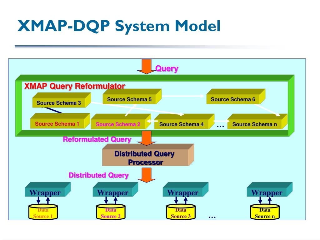 Query XMAP Query Reformulator Source Schema 5 Source Schema 6 Source Schema 3 … Source Schema 1 Source Schema 2 Source Schema 4 Source Schema n Reformulated Query Distributed Query Processor Distributed Query Wrapper Wrapper Wrapper Wrapper … Data Source 1 Data Source 2 Data Source 3 Data Source n XMAP-DQP System Model