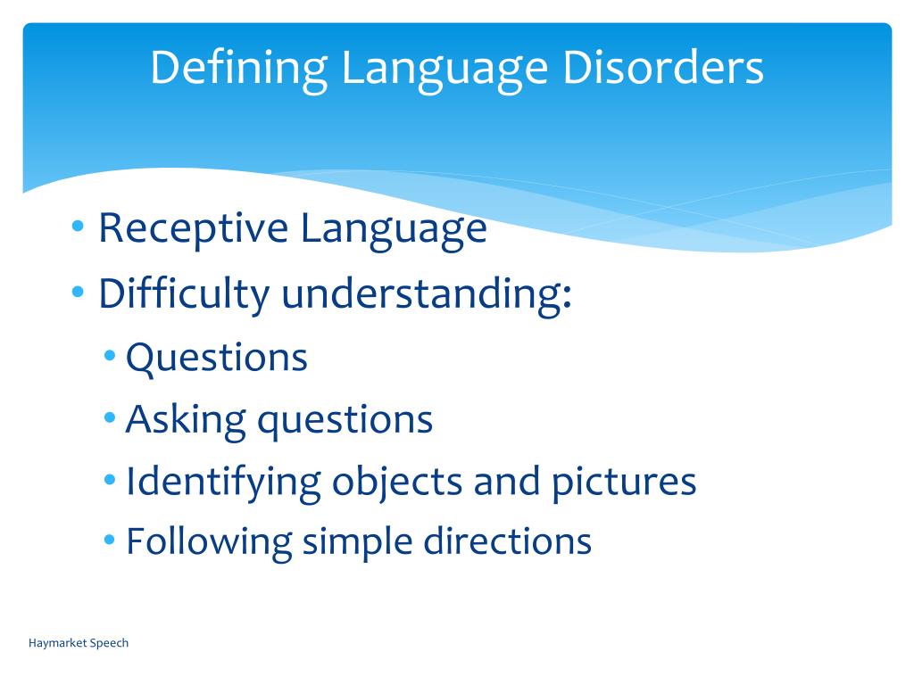 Defining Language Disorders Haymarket Speech • Receptive Language • Difficulty understanding: • Questions • Asking questions • Identifying objects and pictures • Following simple directions