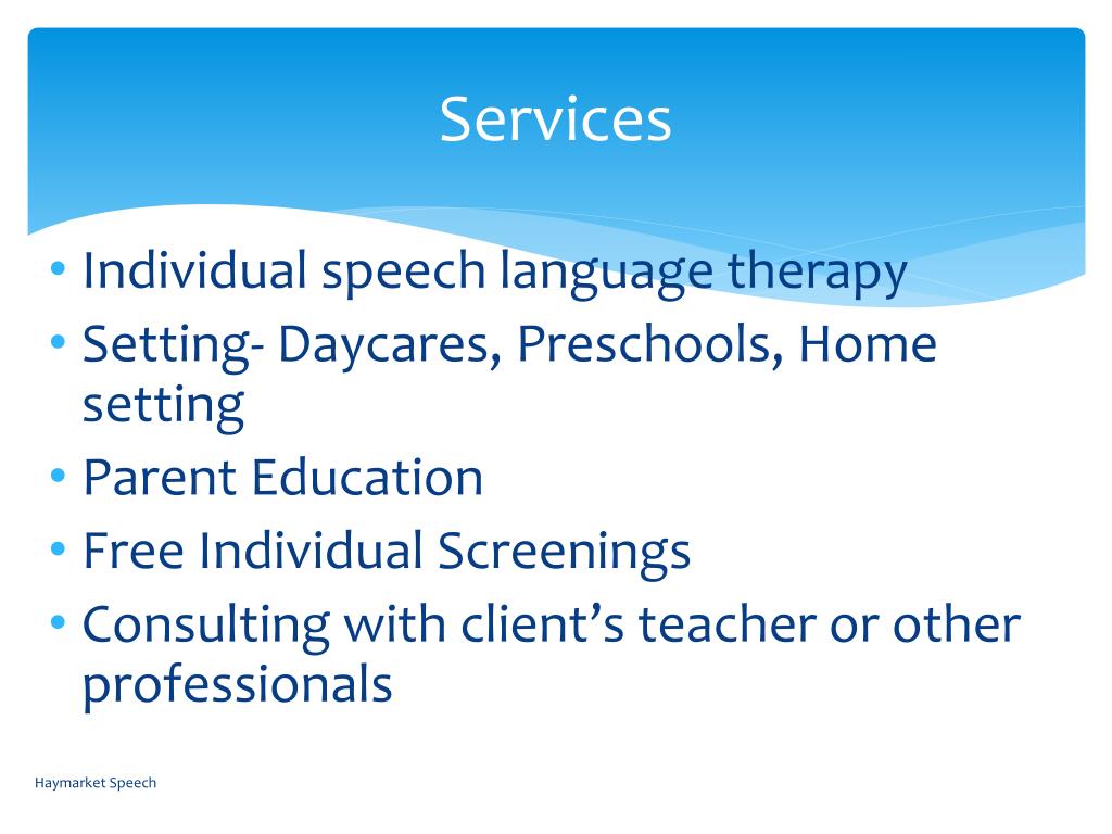 Services Haymarket Speech • Individual speech language therapy • Setting- Daycares, Preschools, Home setting • Parent Education • Free Individual Screenings • Consulting with client’s teacher or other professionals