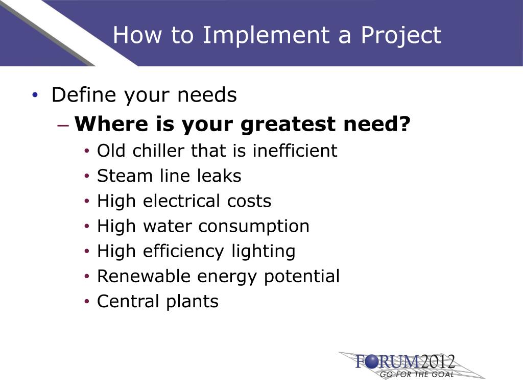 How to Implement a Project • Define your needs • Where is your greatest need? • Old chiller that is inefficient • Steam line leaks • High electrical costs • High water consumption • High efficiency lighting • Renewable energy potential • Central plants
