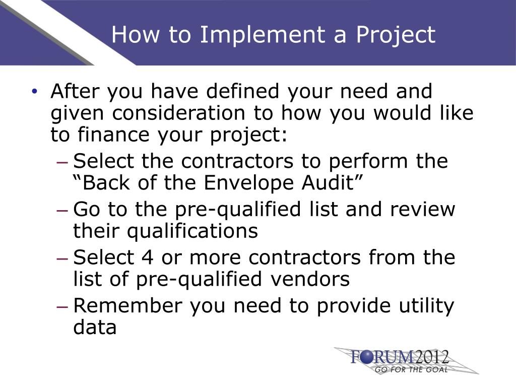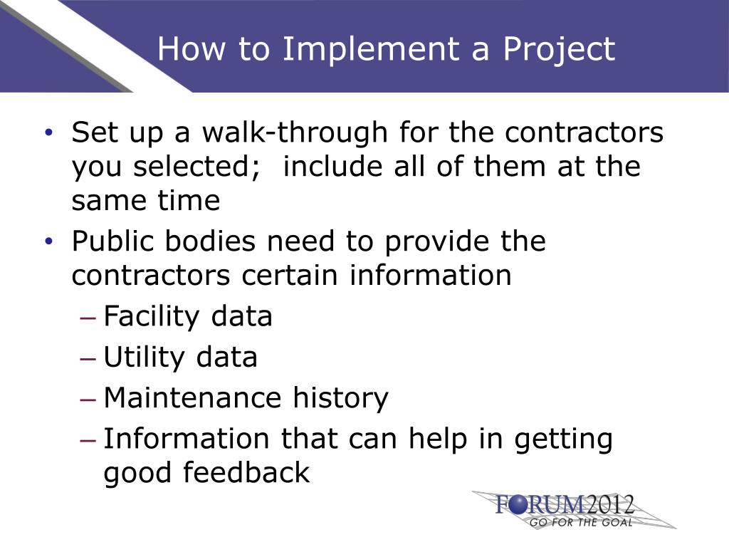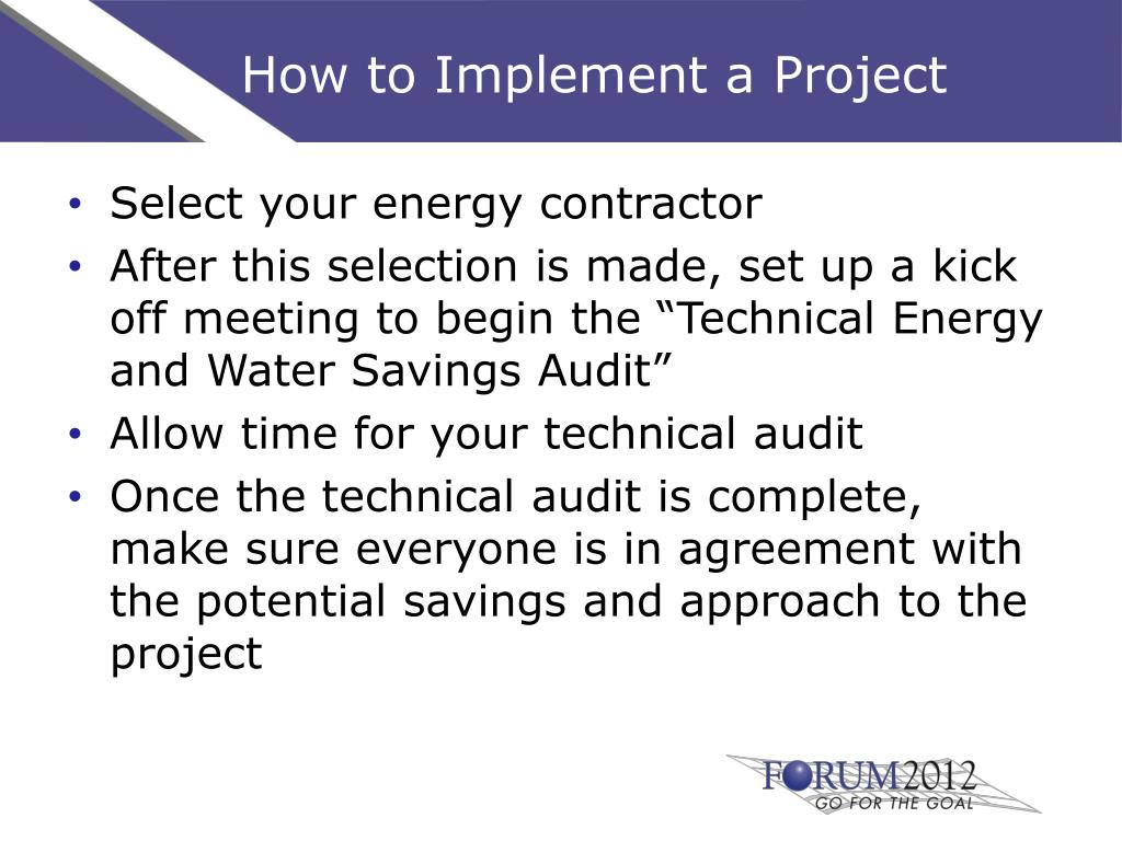 How to Implement a Project Select your energy contractor After this selection is made, set up a kick off meeting to begin the “Technical Energy and Water Savings Audit” Allow time for your technical audit Once the technical audit is complete, make sure everyone is in agreement with the potential savings and approach to the project