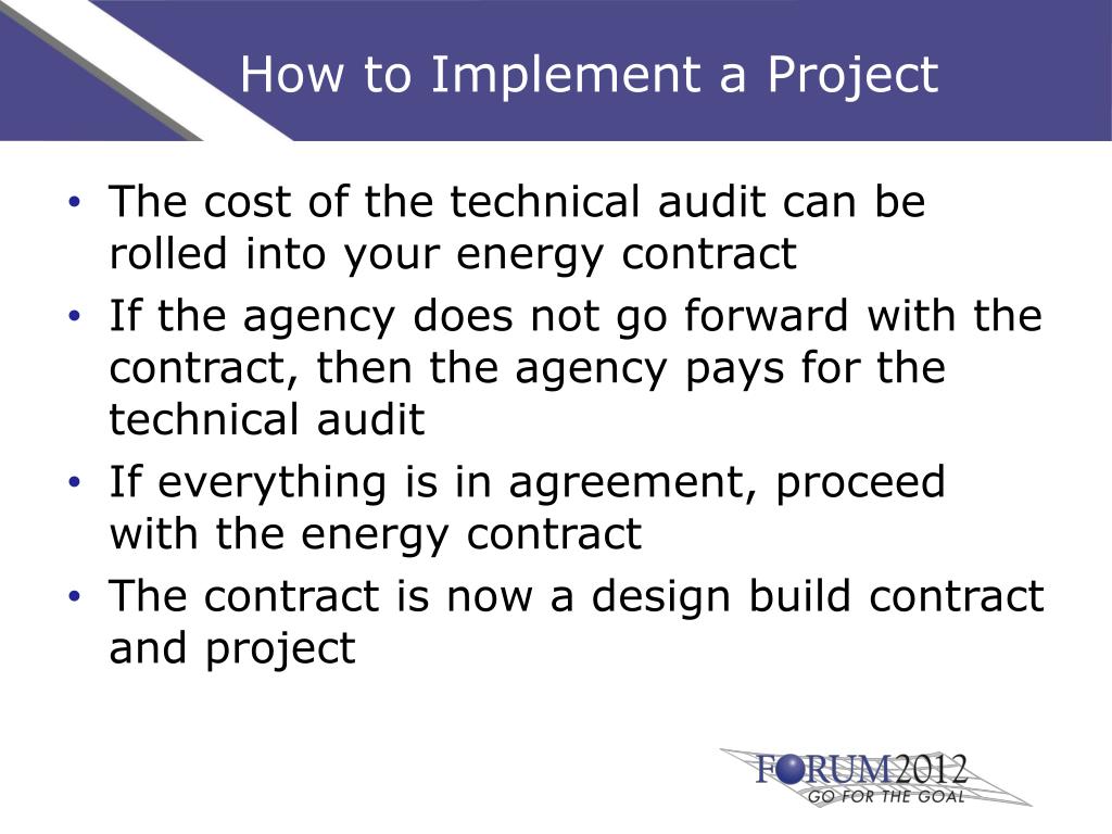 How to Implement a Project The cost of the technical audit can be rolled into your energy contract If the agency does not go forward with the contract, then the agency pays for the technical audit If everything is in agreement, proceed with the energy contract The contract is now a design build contract and project