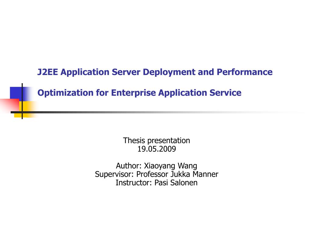 J2EE Application Server Deployment and Performance Optimization for Enterprise Application Service Thesis presentation 19.05.2009 Author: Xiaoyang Wang Supervisor: Professor Jukka Manner Instructor: Pasi Salonen