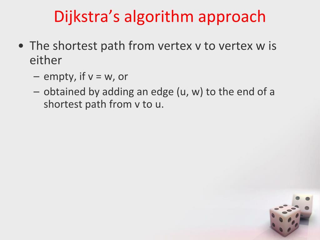 Dijkstra’s algorithm approach • The shortest path from vertex v to vertex w is either • empty, if v = w, or • obtained by adding an edge (u, w) to the end of a shortest path from v to u.