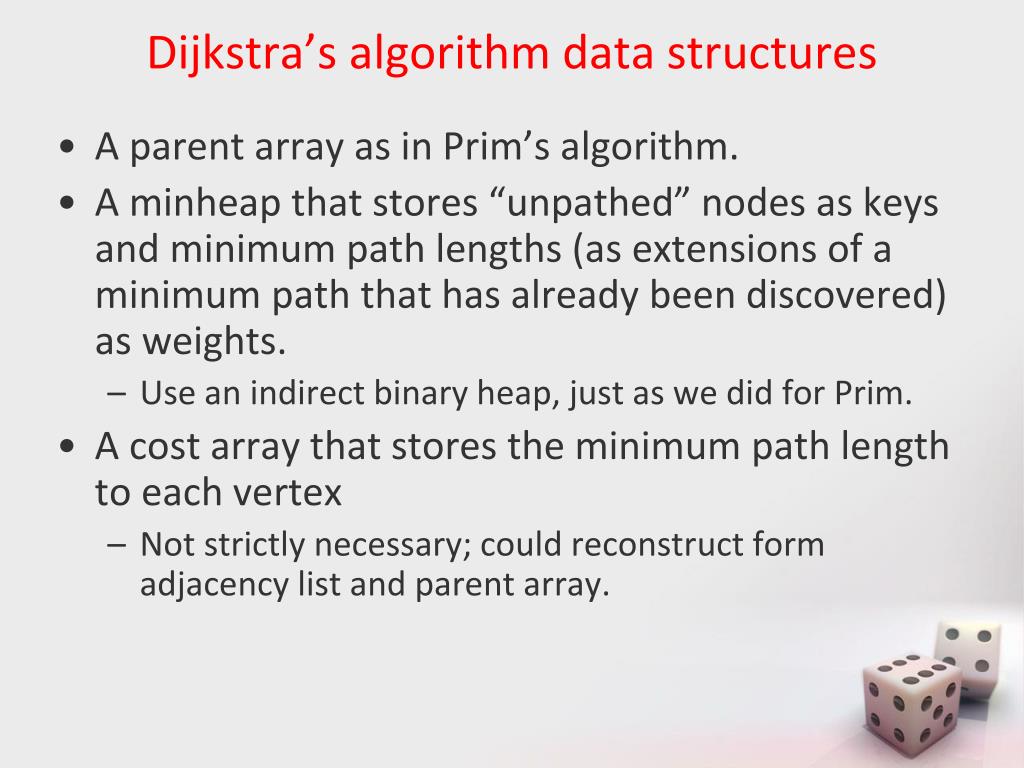 Dijkstra’s algorithm data structures • A parent array as in Prim’s algorithm. • A minheap that stores “unpathed” nodes as keys and minimum path lengths (as extensions of a minimum path that has already been discovered) as weights. • Use an indirect binary heap, just as we did for Prim. • A cost array that stores the minimum path length to each vertex • Not strictly necessary; could reconstruct form adjacency list and parent array.