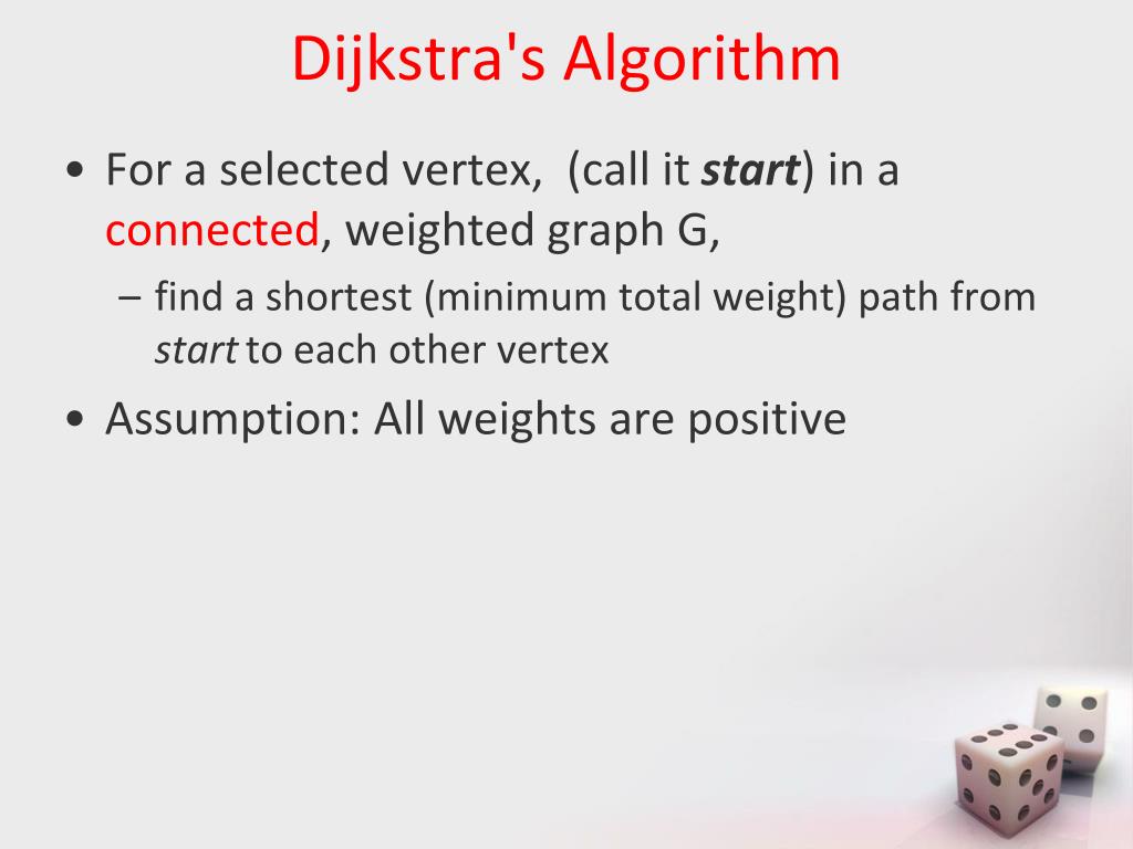 Dijkstra's Algorithm • For a selected vertex, (call it start) in a connected, weighted graph G, • find a shortest (minimum total weight) path from startto each other vertex • Assumption: All weights are positive