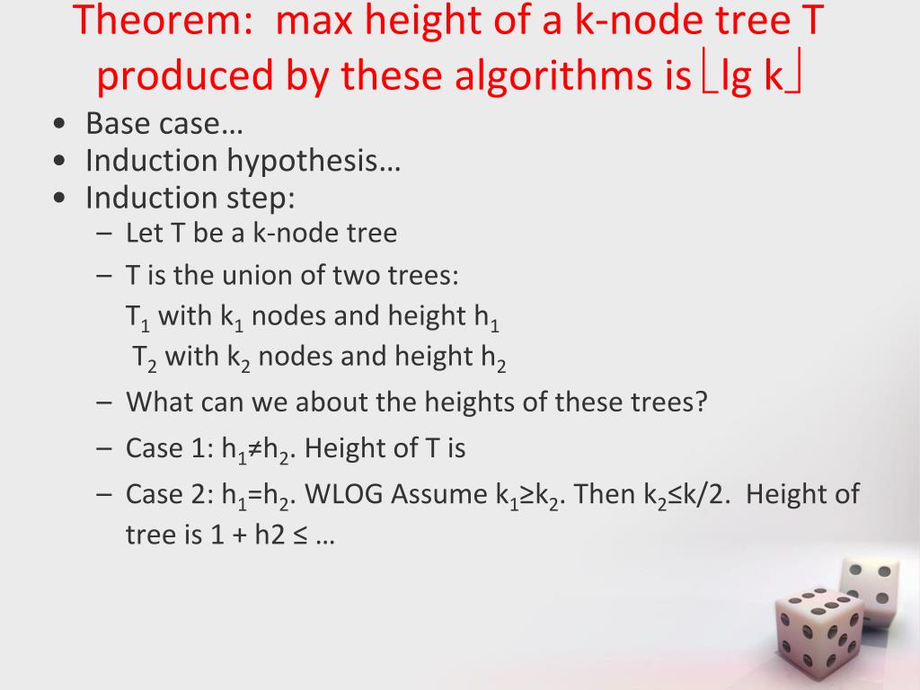 Theorem: max height of a k-node tree T produced by these algorithms is lg k • Base case… • Induction hypothesis… • Induction step: • Let T be a k-node tree • T is the union of two trees: T1with k1nodes and height h1 T2with k2nodes and height h2 • What can we about the heights of these trees? • Case 1: h1≠h2. Height of T is • Case 2: h1=h2. WLOG Assume k1≥k2. Then k2≤k/2. Height of tree is 1 + h2 ≤ …