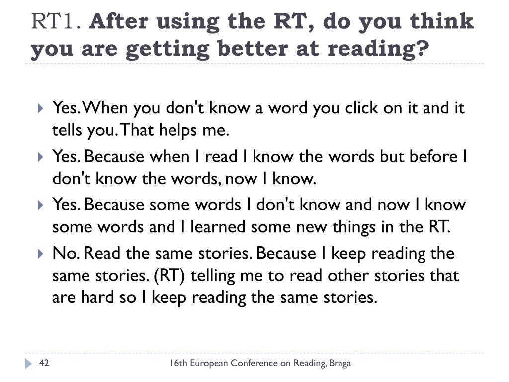 RT1. After using the RT, do you think you are getting better at reading? • Yes. When you don't know a word you click on it and it tells you. That helps me. • Yes. Because when I read I know the words but before I don't know the words, now I know. • Yes. Because some words I don't know and now I know some words and I learned some new things in the RT. • No. Read the same stories. Because I keep reading the same stories. (RT) telling me to read other stories that are hard so I keep reading the same stories. 16th European Conference on Reading, Braga