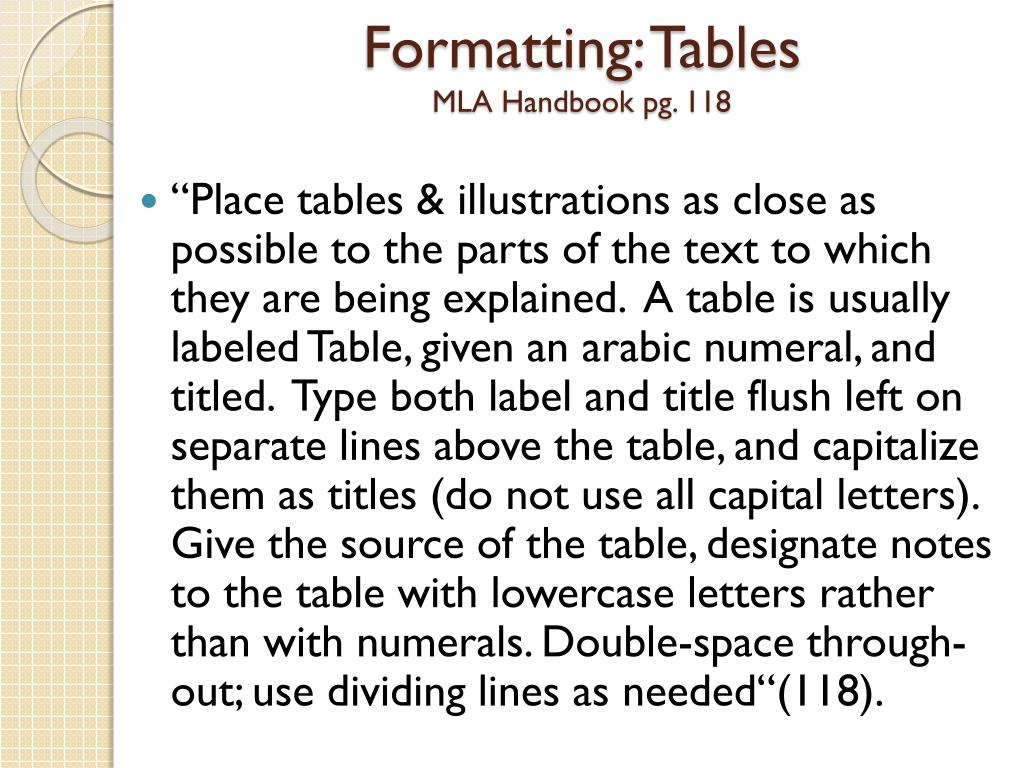 Formatting: Tables MLA Handbook pg. 118 • “Place tables & illustrations as close as possible to the parts of the text to which they are being explained. A table is usually labeled Table, given an arabic numeral, and titled. Type both label and title flush left on separate lines above the table, and capitalize them as titles (do not use all capital letters). Give the source of the table, designate notes to the table with lowercase letters rather than with numerals. Double-space through-out; use dividing lines as needed“(118).