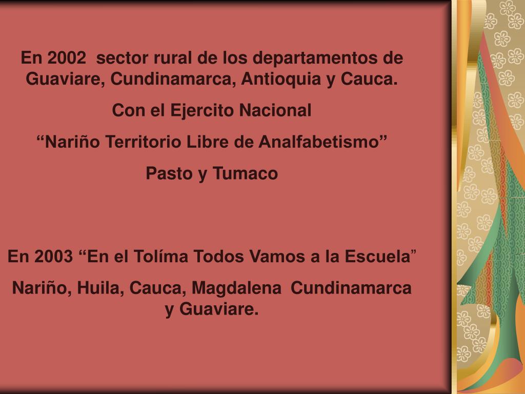 En 2002 sector rural de los departamentos de Guaviare, Cundinamarca, Antioquia y Cauca. Con el Ejercito Nacional “Nariño Territorio Libre de Analfabetismo” Pasto y Tumaco En 2003 “En el Tolíma Todos Vamos a la Escuela” Nariño, Huila, Cauca, Magdalena Cundinamarca y Guaviare.