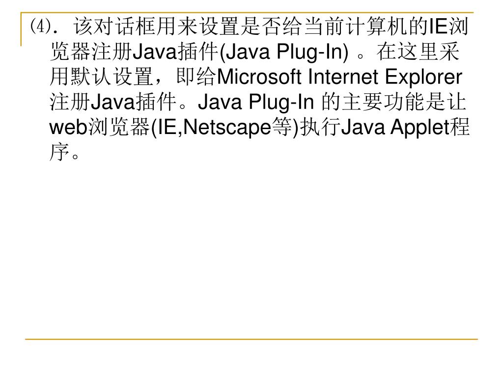 ⑷.该对话框用来设置是否给当前计算机的IE浏览器注册Java插件(Java Plug-In) 。在这里采用默认设置,即给Microsoft Internet Explorer 注册Java插件。Java Plug-In 的主要功能是让web浏览器(IE,Netscape等)执行Java Applet程序。