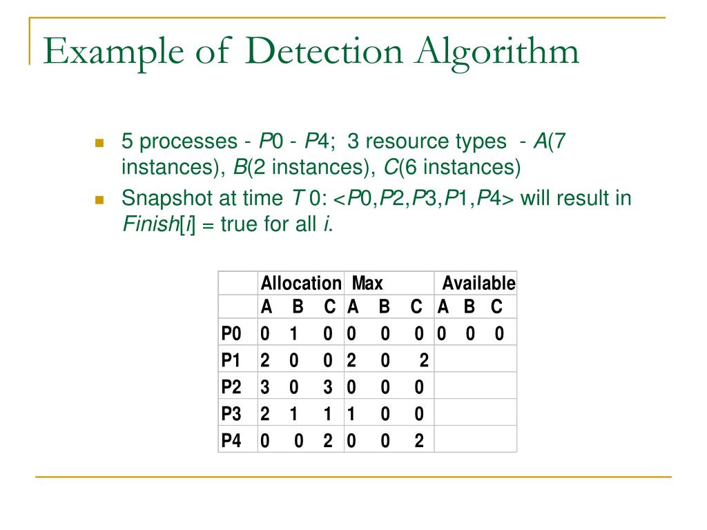 Several instances of a resource type • Data Structures • Available: Vector of length m. If Available[j] = k, there are k instances of resource type Rj available. • Allocation: n m matrix. If Allocation[i,j] = k, then process Pi is currently allocated k instances of resource type Rj. • Request : An n m matrix indicates the current request of each process. If Request [i,j] = k, then process Pi is requesting k more instances of resource type Rj .