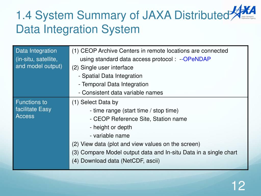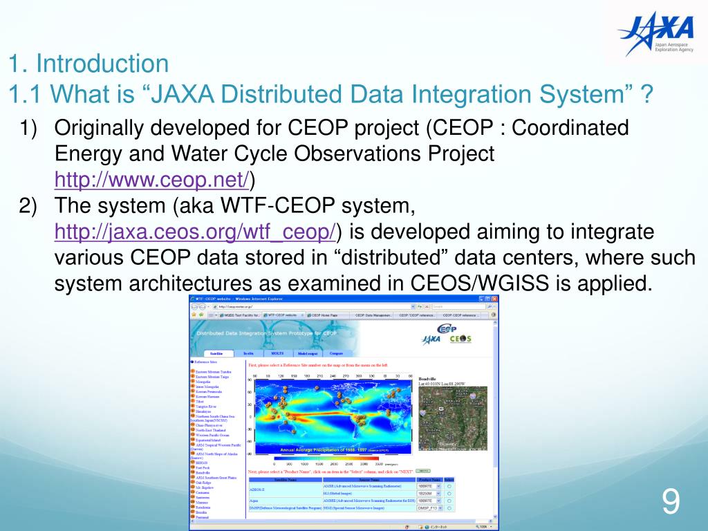 1. Introduction1.1 What is “JAXA Distributed Data Integration System” ? Originally developed for CEOP project (CEOP : Coordinated Energy and Water Cycle Observations Project http://www.ceop.net/) The system (aka WTF-CEOP system, http://jaxa.ceos.org/wtf_ceop/) is developed aiming to integrate various CEOP data stored in “distributed” data centers, where such system architectures as examined in CEOS/WGISS is applied.