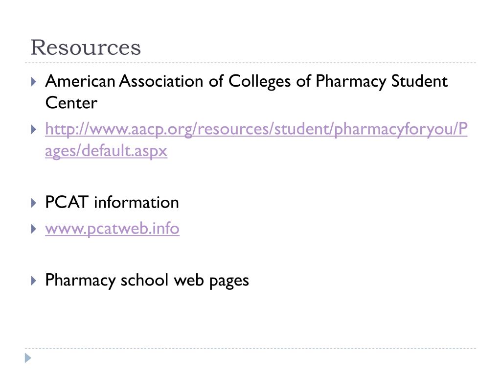 Resources • American Association of Colleges of Pharmacy Student Center • http://www.aacp.org/resources/student/pharmacyforyou/Pages/default.aspx • PCAT information • www.pcatweb.info • Pharmacy school web pages