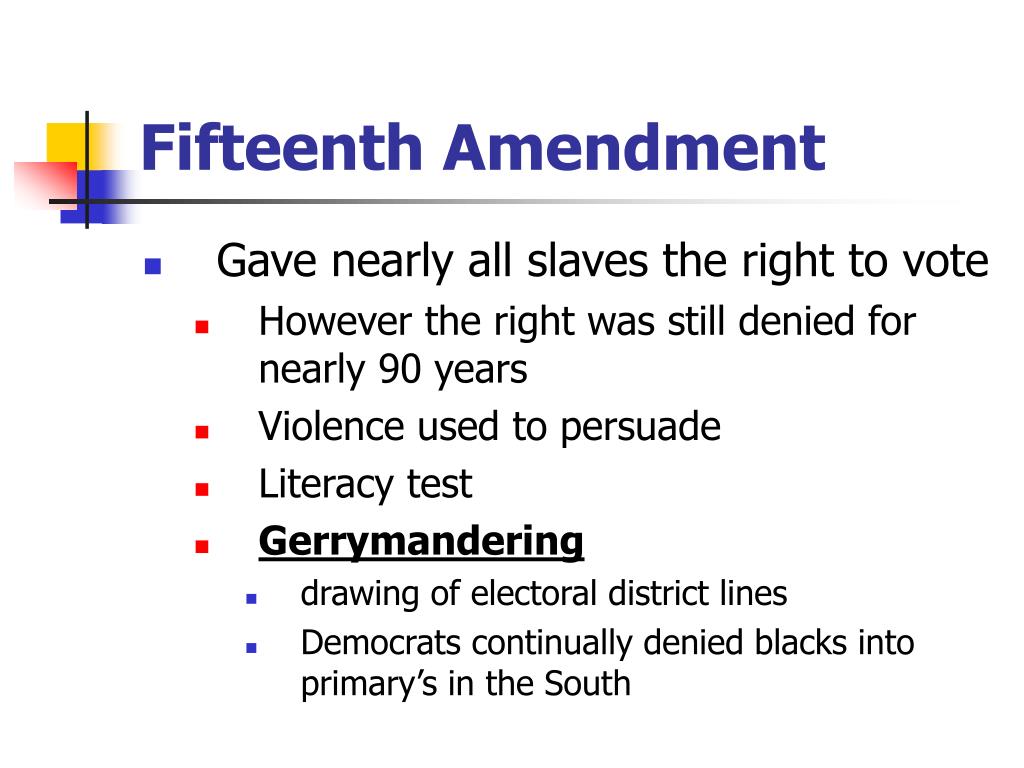 Fifteenth Amendment • Gave nearly all slaves the right to vote • However the right was still denied for nearly 90 years • Violence used to persuade • Literacy test • Gerrymandering • drawing of electoral district lines • Democrats continually denied blacks into primary’s in the South