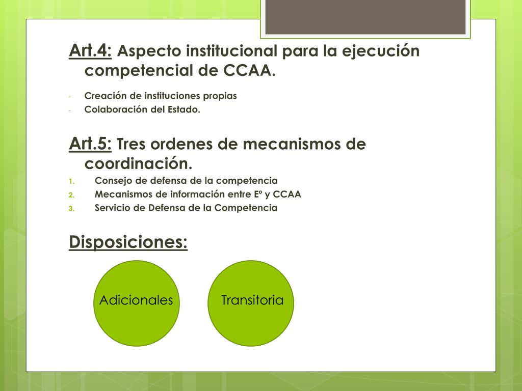 Art.4:Aspecto institucional para la ejecución competencial de CCAA. • Creación de instituciones propias • Colaboración del Estado. Art.5:Tres ordenes de mecanismos de coordinación. • Consejo de defensa de la competencia • Mecanismos de información entre Eº y CCAA • Servicio de Defensa de la Competencia Disposiciones: Adicionales Transitoria