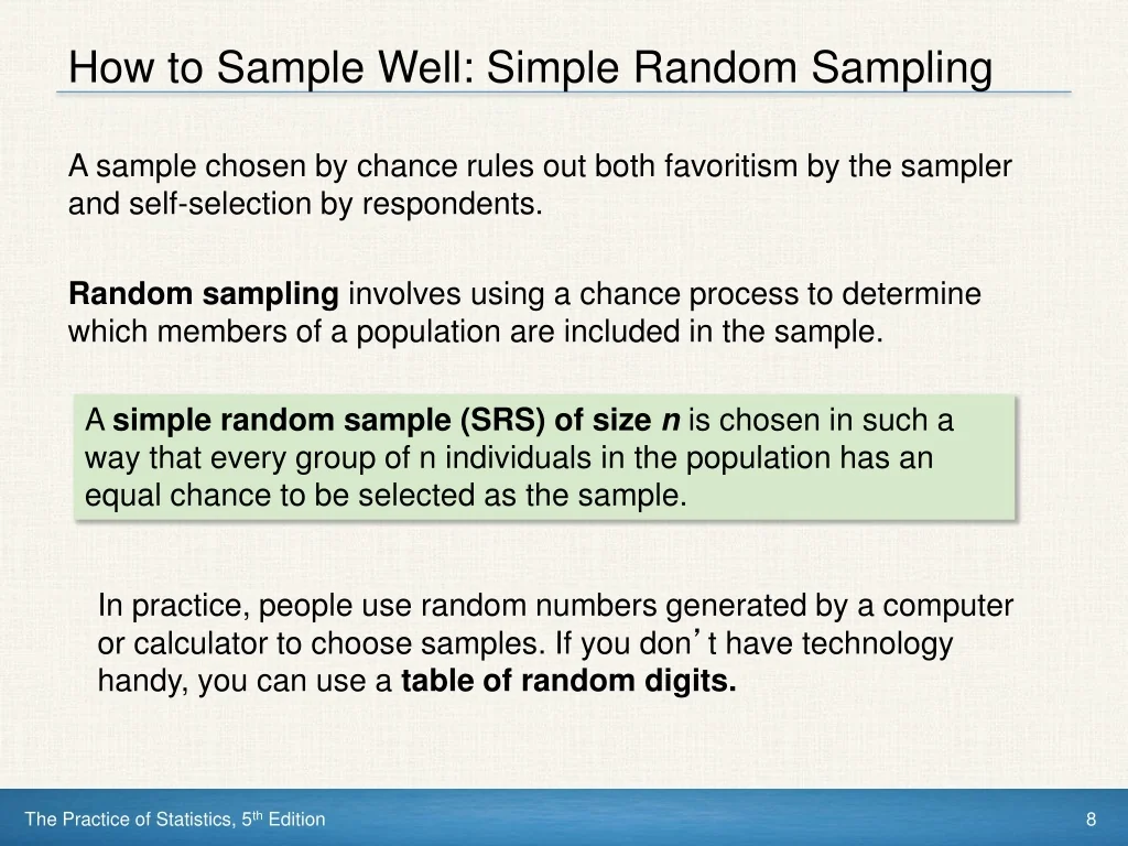 How to Sample Well: Simple Random Sampling A sample chosen by chance rules out both favoritism by the sampler and self-selection by respondents. Random sampling involves using a chance process to determine which members of a population are included in the sample. A simple random sample (SRS) of size nis chosen in such a way that every group of n individuals in the population has an equal chance to be selected as the sample. In practice, people use random numbers generated by a computer or calculator to choose samples. If you don’t have technology handy, you can use a table of random digits.