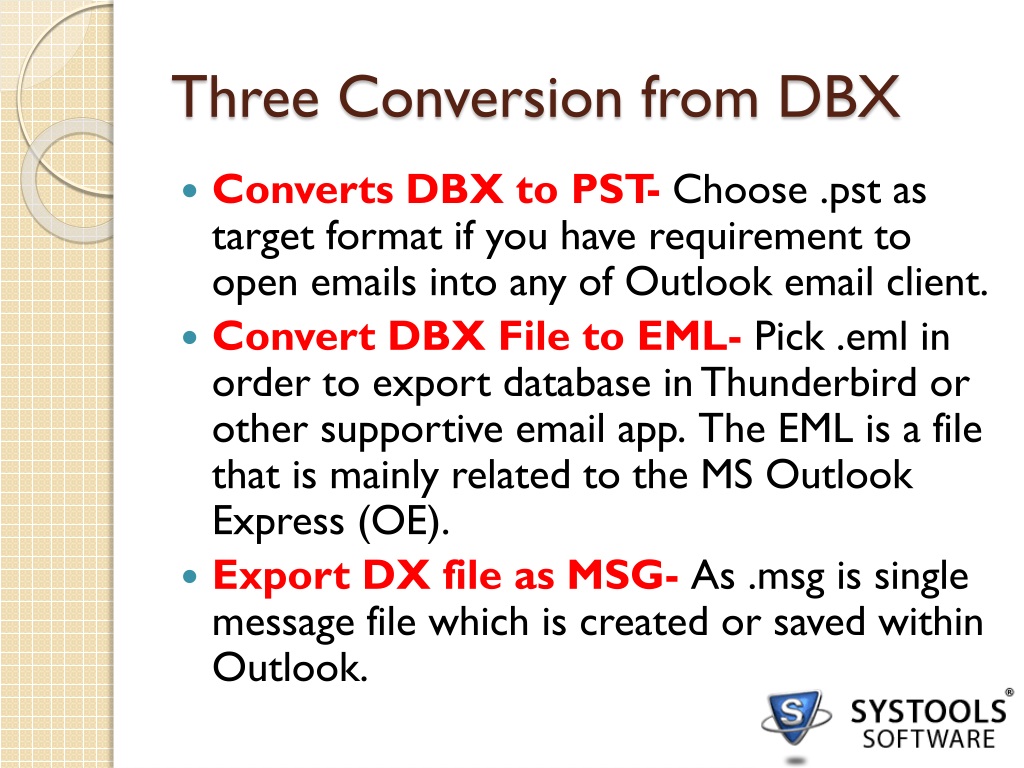 Three Conversion from DBX • Converts DBX to PST- Choose .pst as target format if you have requirement toopen emails into any of Outlook email client. • Convert DBX File to EML- Pick .emlin order to export database in Thunderbird or other supportive email app.The EML is a file that is mainly related to the MS Outlook Express (OE). • Export DX file as MSG- As .msg is single message file which is created or saved within Outlook.