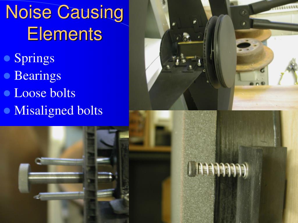 Noise Causing Elements • Springs • Bearings • Loose bolts • Misaligned bolts