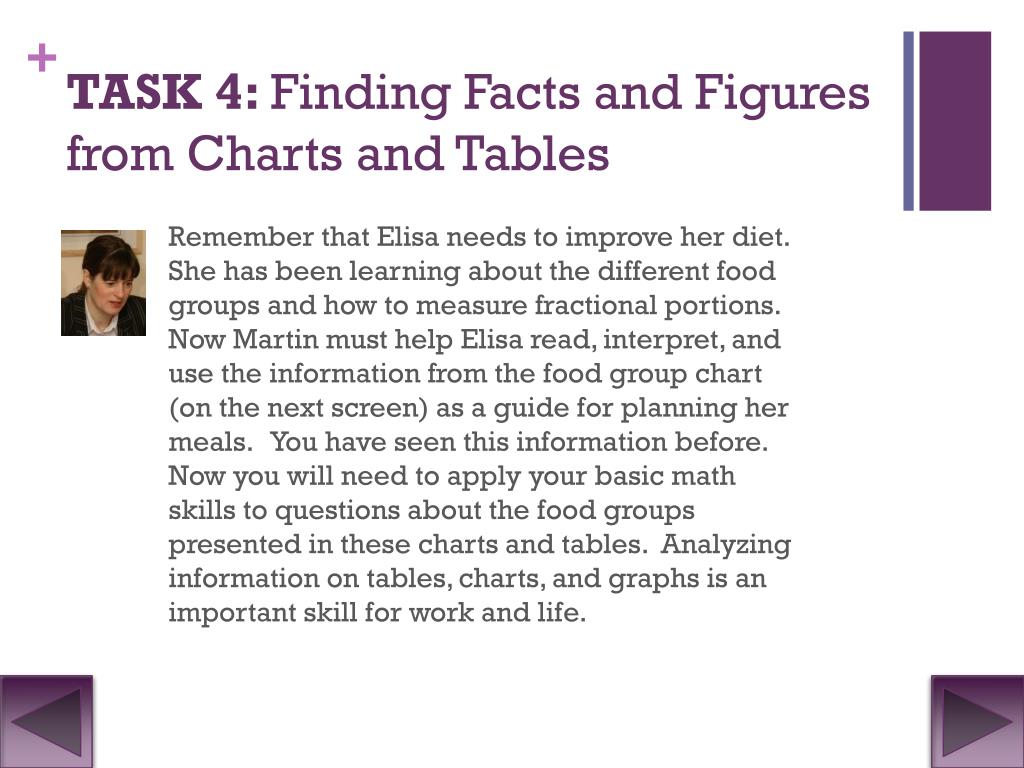 TASK 4: Finding Facts and Figures from Charts and Tables Remember that Elisa needs to improve her diet. She has been learning about the different food groups and how to measure fractional portions. Now Martin must help Elisa read, interpret, and use the information from the food group chart (on the next screen) as a guide for planning her meals. You have seen this information before. Now you will need to apply your basic math skills to questions about the food groups presented in these charts and tables. Analyzing information on tables, charts, and graphs is an important skill for work and life.