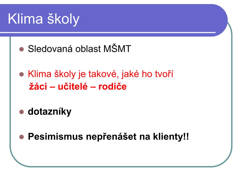 Klima školy • Sledovaná oblast MŠMT • Klima školy je takové, jaké ho tvoří žáci – učitelé – rodiče • dotazníky • Pesimismus nepřenášet na klienty!!
