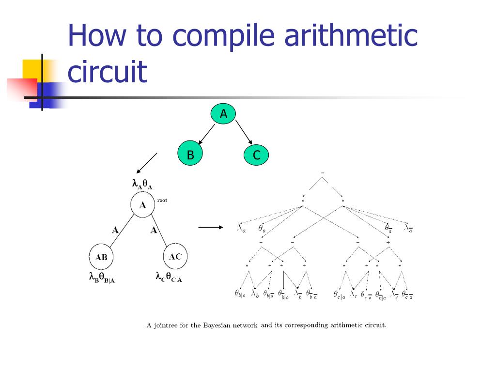 Arithmetic circuit • An arithmetic circuit is a graphical representation of a function f over variables E. • Definition 3. An arithmetic circuit over variables E is a rooted, directed acyclic graph whose leaf nodes are labeled with numeric constants or variables in E and whose other nodes are labeled with multiplication and addition operations. The size of an arithmetic circuit is measured by the number of edges that it contains. • Q1:how to obtain a compact arithmetic circuit that computes a given network polynomial? • Q2:How can we efficiently evaluate and differentiate a circuit?