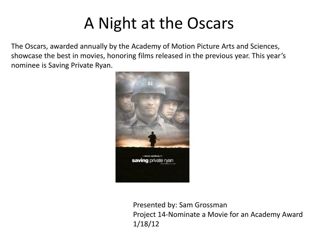 A Night at the Oscars The Oscars, awarded annually by the Academy of Motion Picture Arts and Sciences, showcase the best in movies, honoring films released in the previous year. This year’s nominee is Saving Private Ryan. Presented by: Sam Grossman Project 14-Nominate a Movie for an Academy Award 1/18/12