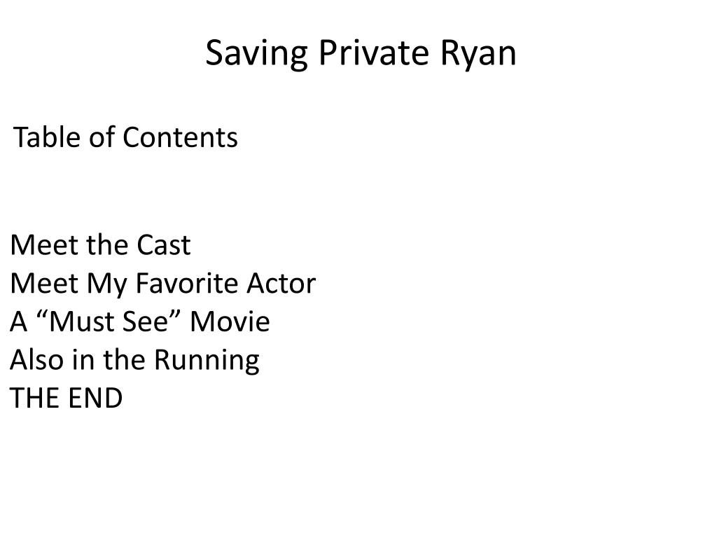 Saving Private Ryan Table of Contents Meet the Cast Meet My Favorite Actor A “Must See” Movie Also in the Running THE END