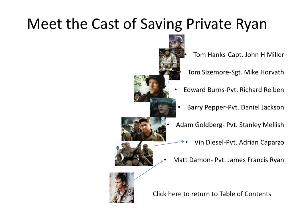 Meet the Cast of Saving Private Ryan • Tom Hanks-Capt. John H Miller • Tom Sizemore-Sgt. Mike Horvath • Edward Burns-Pvt. Richard Reiben • Barry Pepper-Pvt. Daniel Jackson • Adam Goldberg- Pvt. Stanley Mellish • Vin Diesel-Pvt. Adrian Caparzo • Matt Damon- Pvt. James Francis Ryan Click here to return to Table of Contents