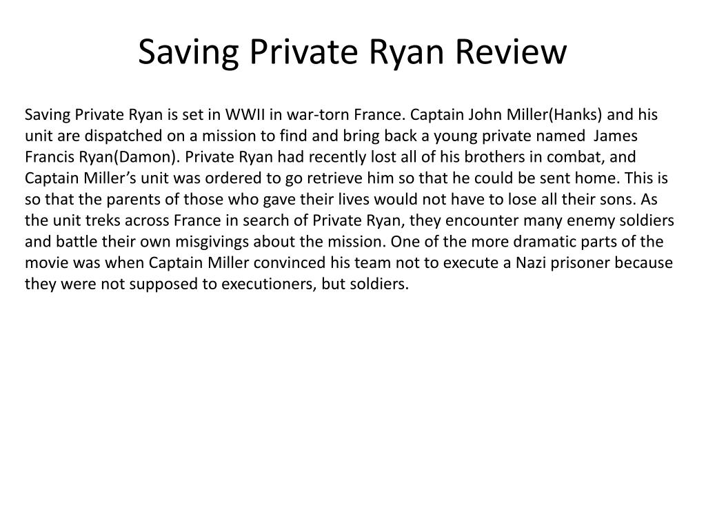 Saving Private Ryan Review Saving Private Ryan is set in WWII in war-torn France. Captain John Miller(Hanks) and his unit are dispatched on a mission to find and bring back a young private named James Francis Ryan(Damon). Private Ryan had recently lost all of his brothers in combat, and Captain Miller’s unit was ordered to go retrieve him so that he could be sent home. This is so that the parents of those who gave their lives would not have to lose all their sons. As the unit treks across France in search of Private Ryan, they encounter many enemy soldiers and battle their own misgivings about the mission. One of the more dramatic parts of the movie was when Captain Miller convinced his team not to execute a Nazi prisoner because they were not supposed to executioners, but soldiers.